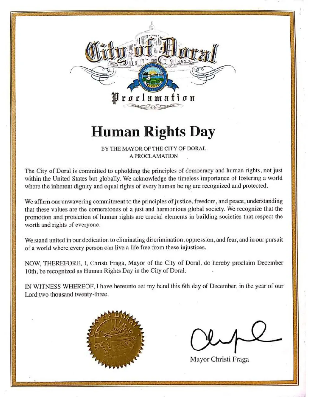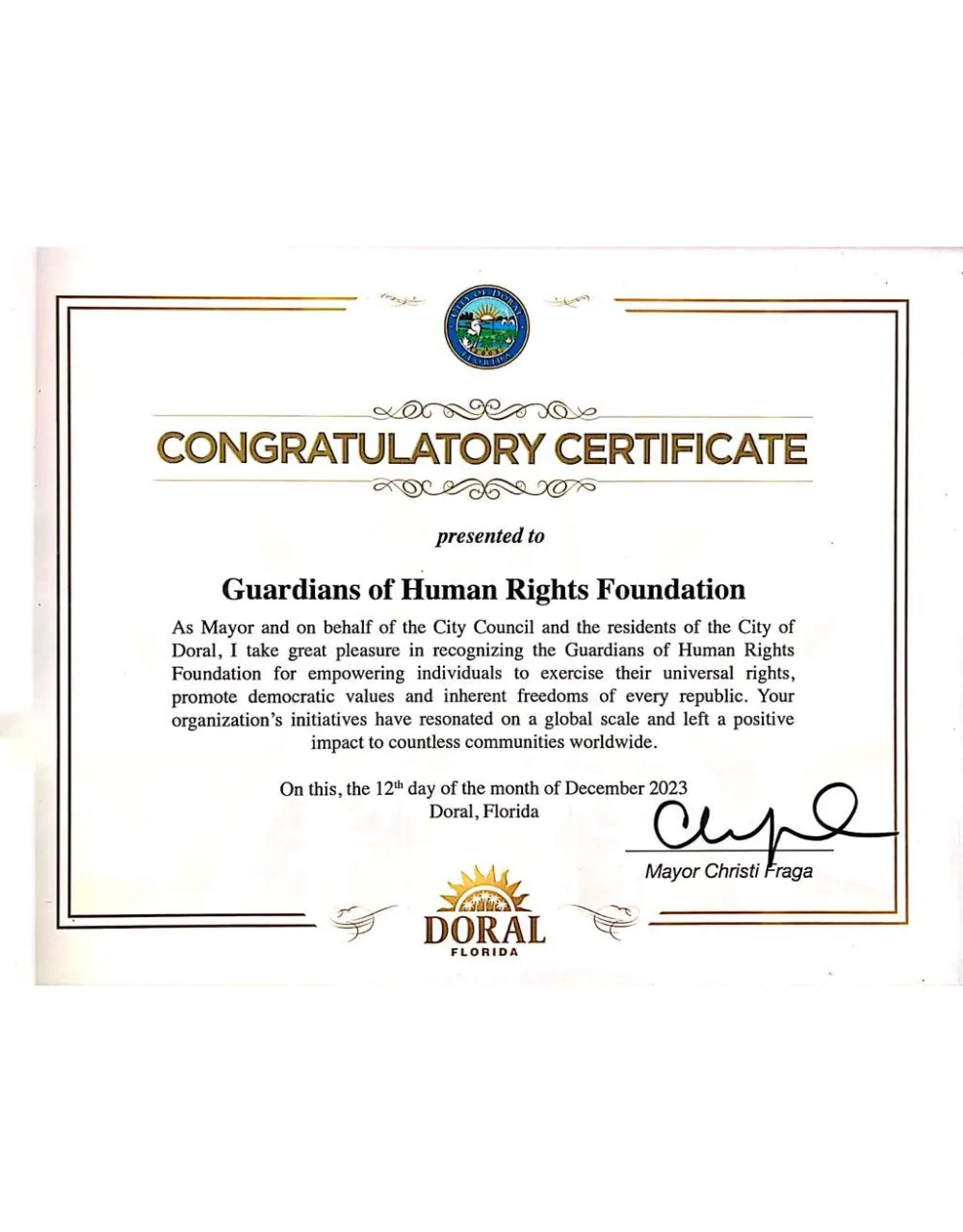 Our work has been recognized at every level—local, state, federal, and international. From proclamations issued by the cities of Doral and Sweetwater to commendations from the White House and the U.S. Congress, these honors affirm our commitment to leading initiatives that transform lives and strengthen communities.