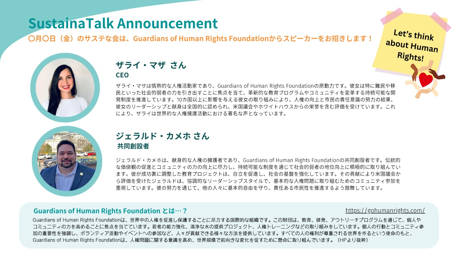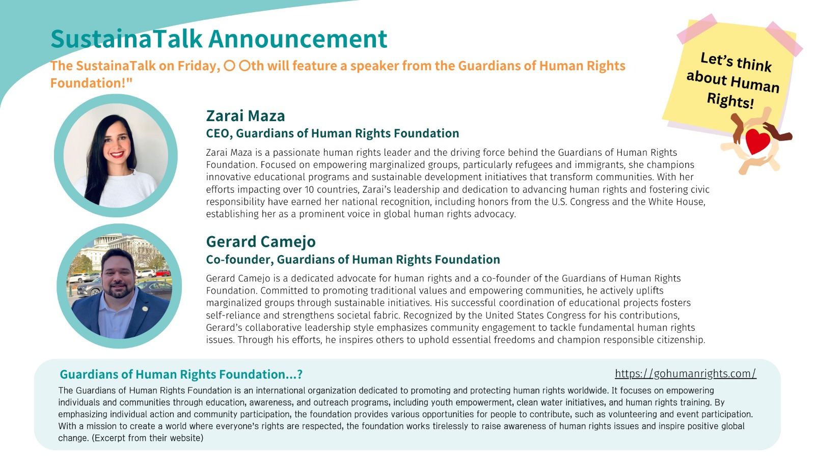 By connecting human rights advocacy with sustainability frameworks and private-sector engagement, Diego helps position Guardians of Human Rights within key international conversations in Japan, reinforcing the organization’s commitment to responsible development, institutional collaboration, and global impact.
